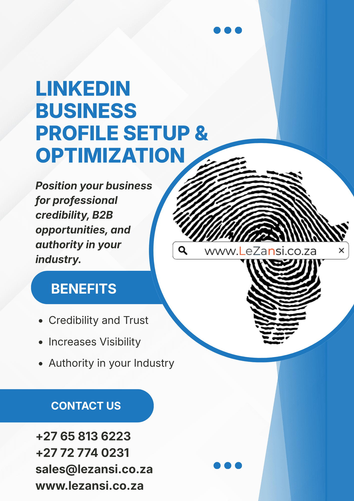 LeZansi helps you establish a powerful presence on LinkedIn — the world’s leading professional networking platform — by creating and optimizing your business profile for maximum visibility, authority, and lead generation.